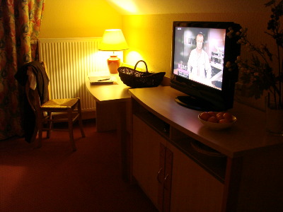 ... mit anschließender Fernseh-Anrichte (26 Zoll LCD Flachbild ) und kleinem Schreibtisch ...